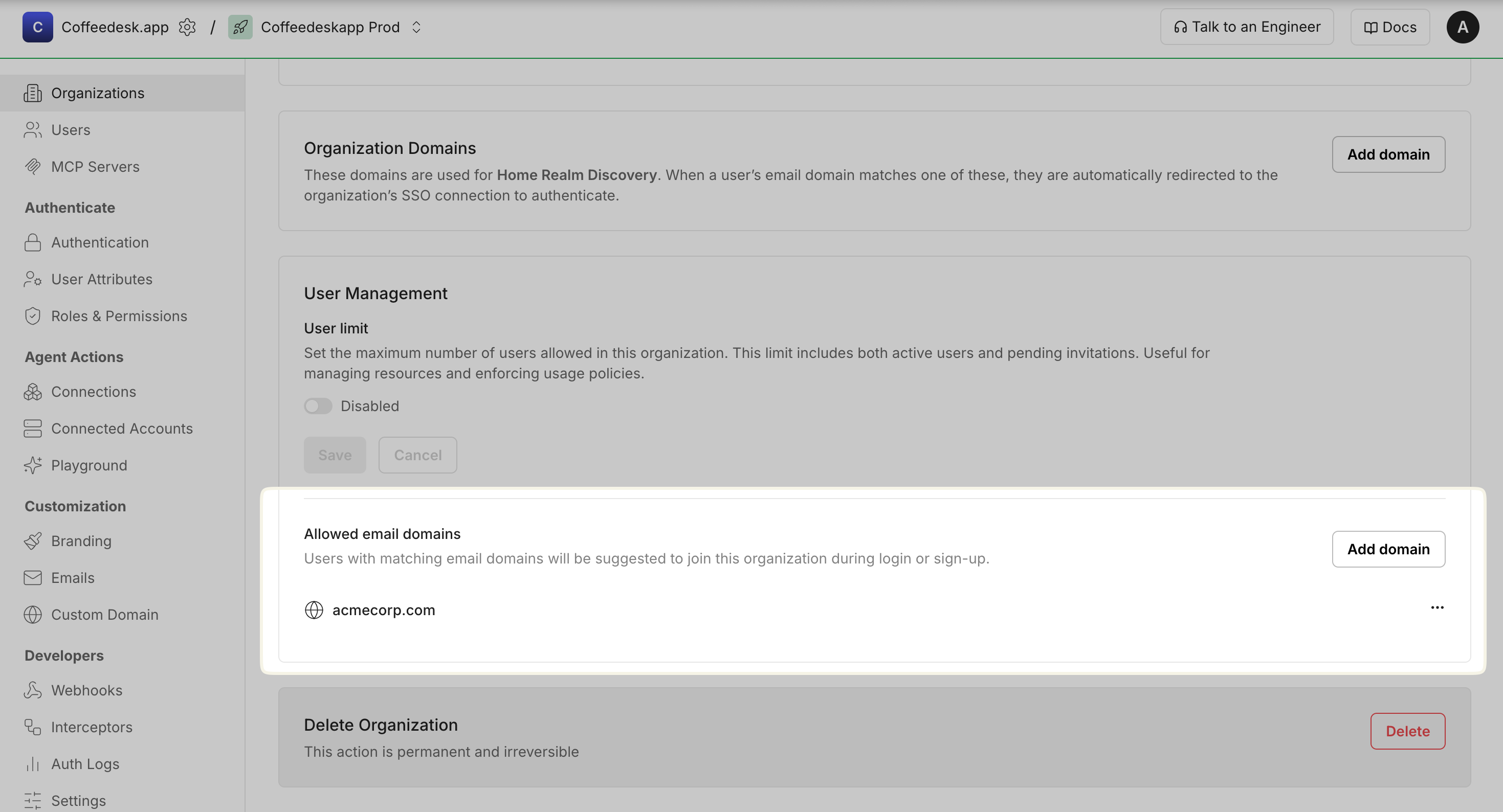 # 4. Delete an allowed email domain# Use case: Remove domain restrictions or clean up unused configurationscurl 'https://<SCALEKIT_ENVIRONMENT_URL>/api/v1/organizations/{organization_id}/domains/{domain_id}' \ --request DELETE// 1. Register an allowed email domain// Use case: Restrict user registration to specific company domains for B2B applicationsconst newDomain = await scalekit.createDomain("org-123", "customerdomain.com", { domainType: "ALLOWED_EMAIL_DOMAIN",});