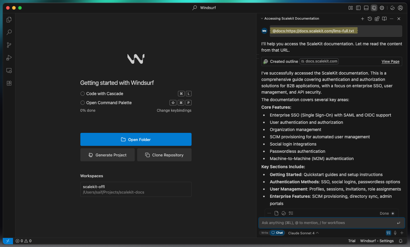 Once configured, use @Scalekit Docs in your chat to ask questions about Scalekit features, APIs, and integration guides. Cursor will search the latest documentation to provide accurate, up-to-date answers.