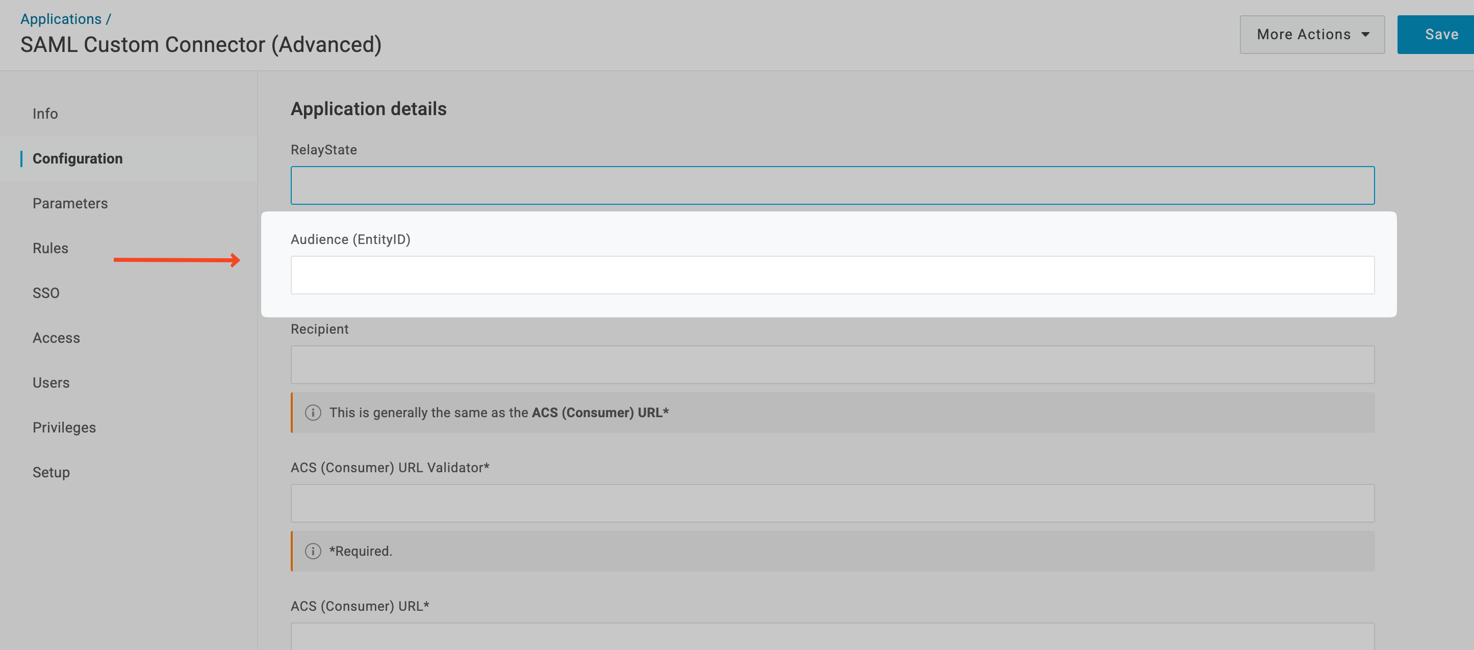 From your SSO Configuration Portal, copy the ACS (Consumer) URL. Go back to your OneLogin Admin Portal, and paste it in the Recipient, ACS (Consumer) URL Validator, and ACS(Consumer) URL fields.